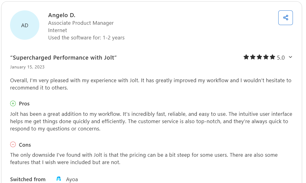 “Jolt has been a great addition to my workflow. It’s incredibly fast, reliable, and easy to use. The intuitive user interface helps me get things done quickly and efficiently. ” — Angelo D. (Associate Product Manager).